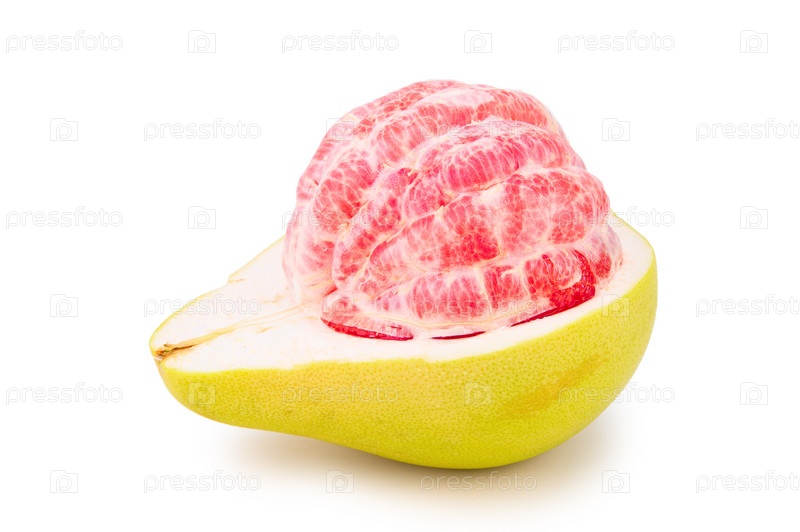 Наполовину очищенный плод помело с красной мякотью и толстой кожурой