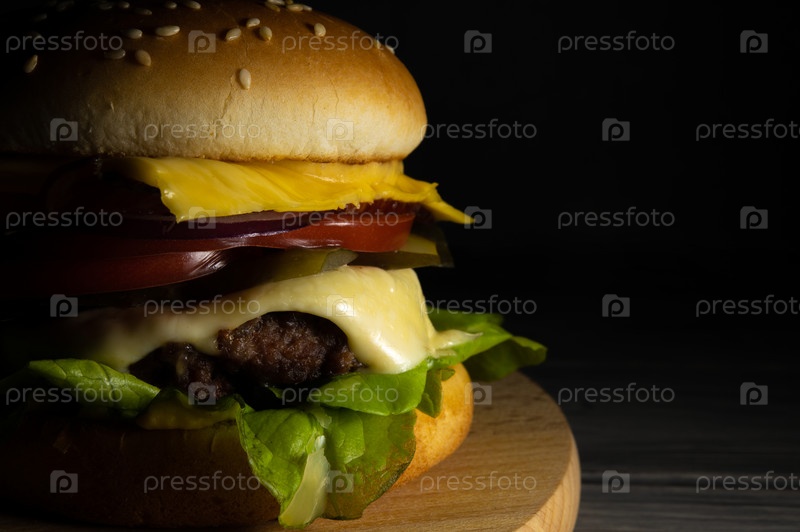 Гамбургер в поджаренной булочке с кунжутом, солеными огурцами и спелыми помидорами