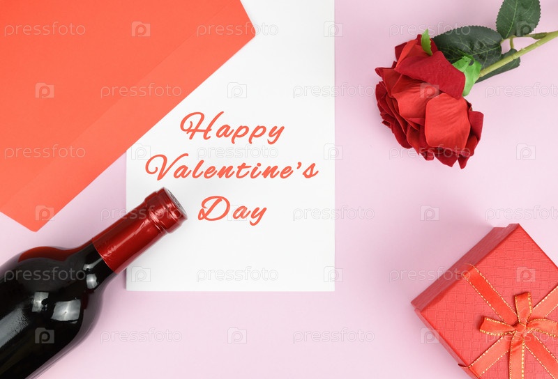 На розовом фоне лежат красная роза, бутылка вина, конверт с поздравлением и подарочная коробка