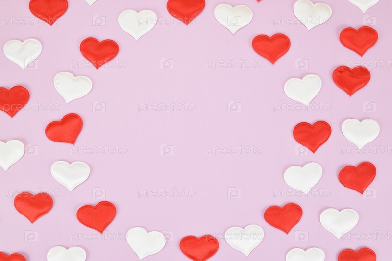 Красные и белые декоративные сердца, расположенные в виде рамки на изображении. В центре есть пустое место для текста