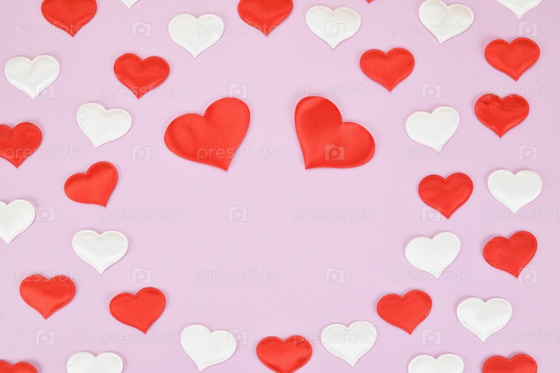 Красные и белые декоративные сердца расположены вокруг двух больших сердец. В центре оставлено пустое место для текста