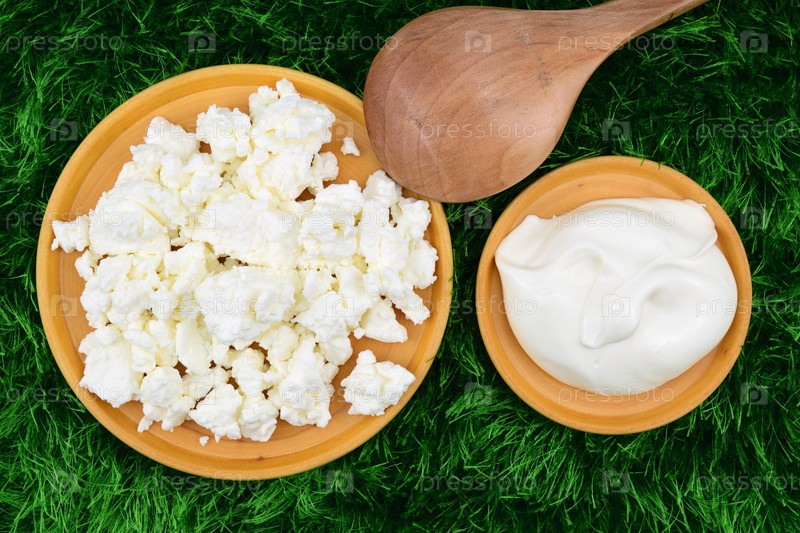 Деревенская сметана и творог на деревянных тарелках на зеленой траве и деревянной ложкой