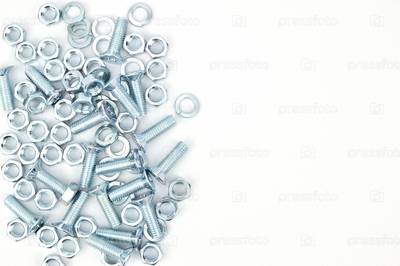 Несколько винтов, гаек и шайб, разложенных в левой части изображения