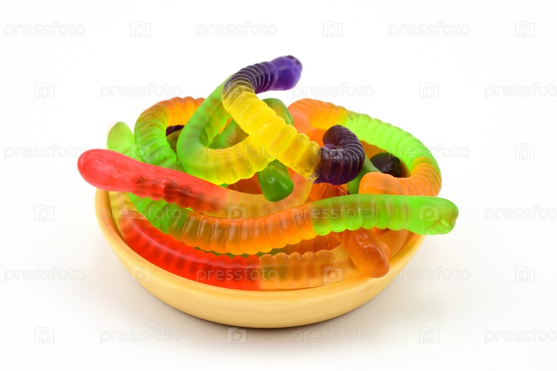 Мармеладные конфеты в виде разноцветных червячков, высыпанные на деревянную тарелку