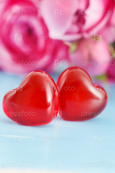 Два красных сердца на фоне роз