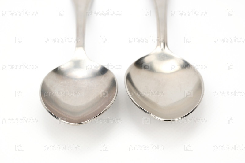 Вид спереди двух столовых ложек, лежащих вверх дном на белом фоне