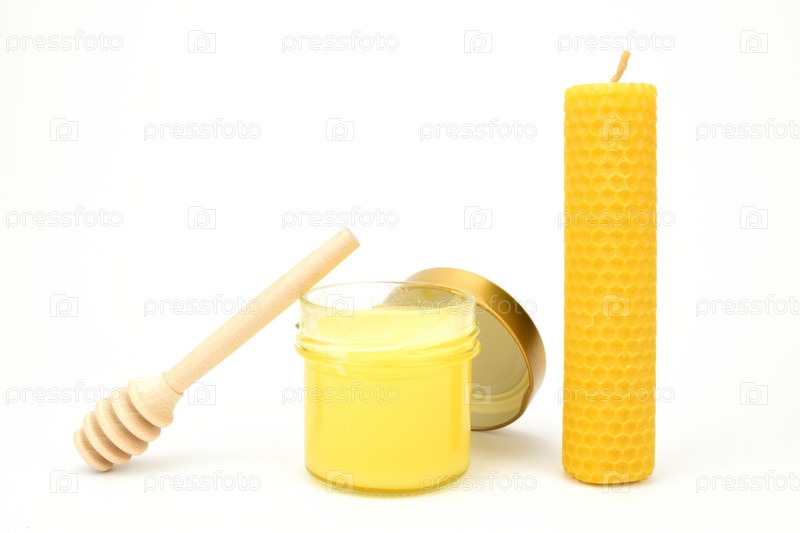 Банка меда с прислоненным к ней черпаком. Рядом стоит восковая свеча
