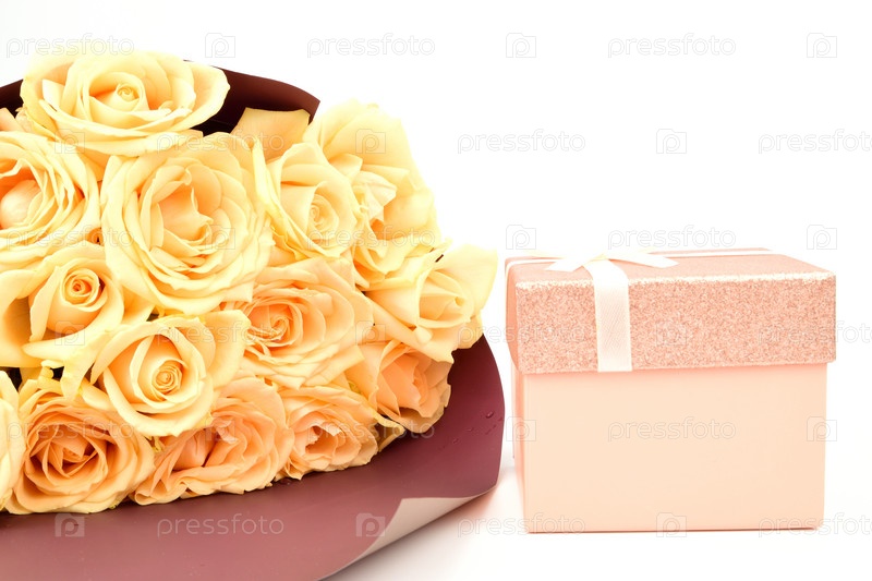 Букет белых роз, завернутых в подарочную бумагу, рядом с розовой подарочной коробкой