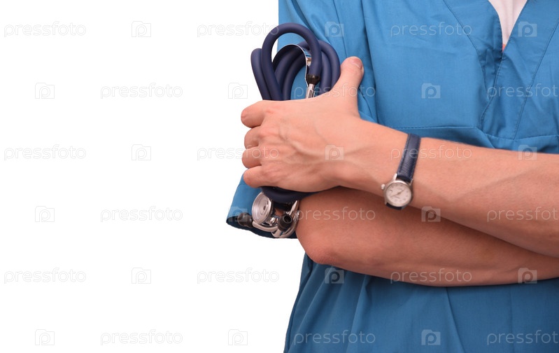 Врач в синем костюме со стетоскопами в руках. Торс женщины-врача