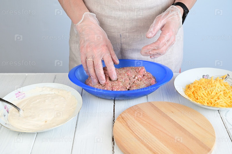 Женщина в прозрачных перчатках отделяет кусок фарша от общей массы, чтобы слепить котлету