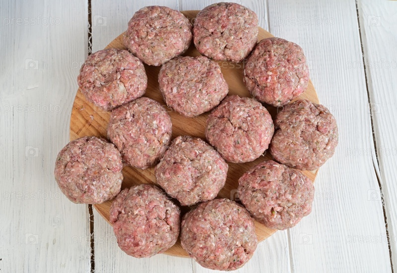 Котлеты из рубленого мяса, разложенные на деревянной разделочной доске, на белом столе