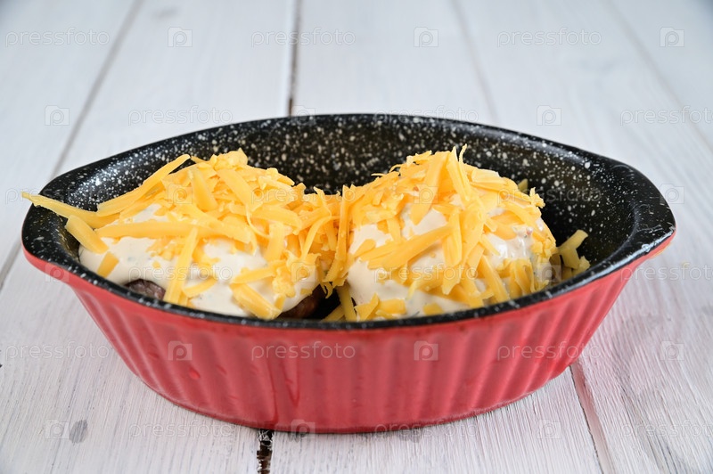 Две котлеты из рубленого мяса помещаем в красную форму для запекания