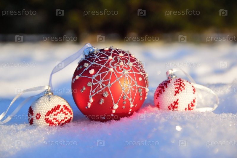 Елочные игрушки, шары лежат на снегу, освещенные низким зимним солнцем