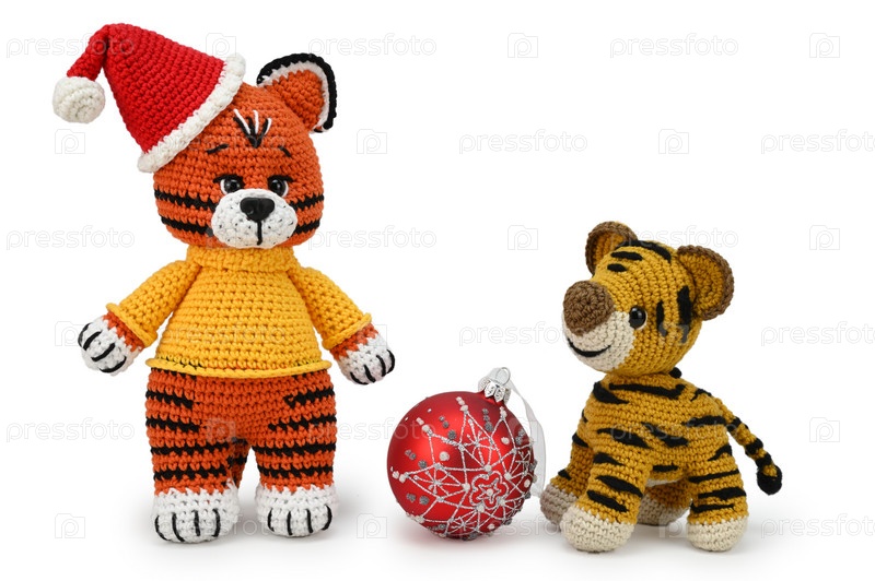 Тигр в новогодней шапке на задних лапах, рядом с ним маленький тигр на четырех лапах. Между ними лежит елочная игрушка