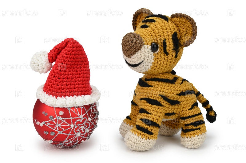 Вязаный тигр на четырех лапах стоит рядом с елочной игрушкой, на которой надета рождественская шапочка