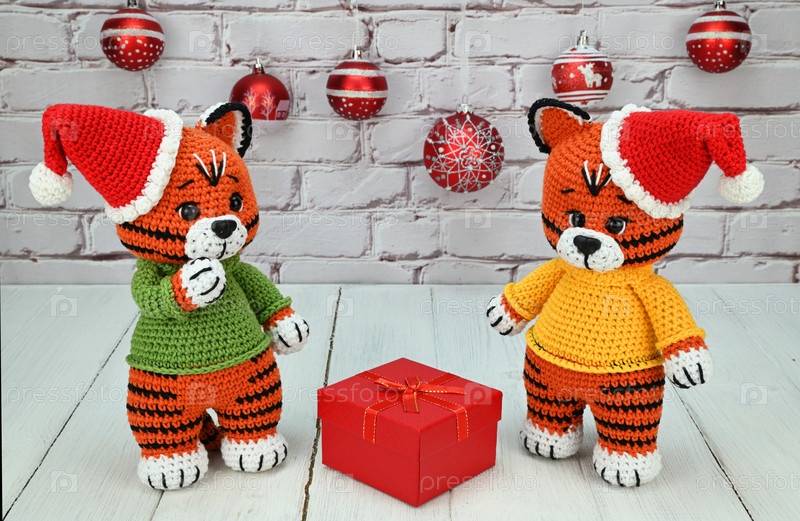 Два вязаных тигра стоят в новогодних шапках на задних лапах. Между ними лежит новогодний подарок