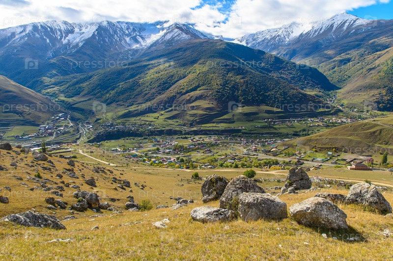 Горный пейзаж с заснеженными вершинами на фоне голубого неба