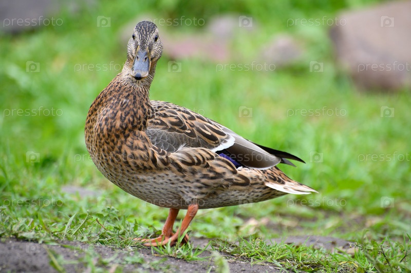 Утка стоит на траве и смотрит в камеру