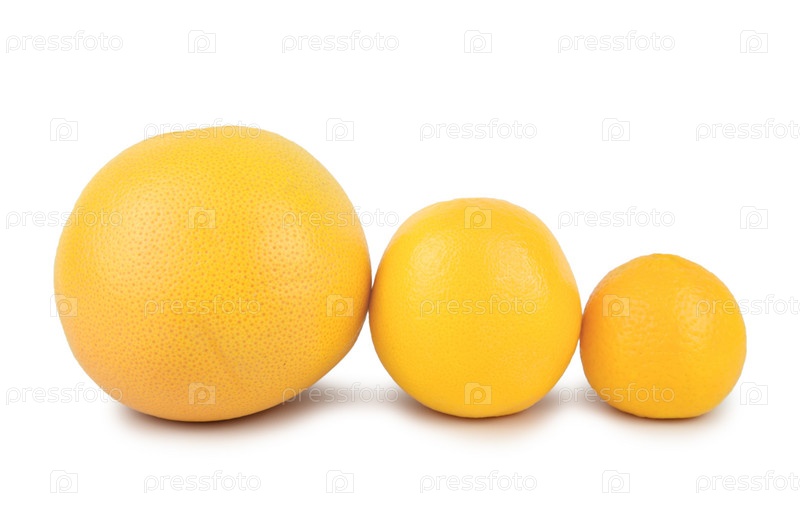 Грейпфрут, апельсин и мандарин выстроены в ряд по размеру