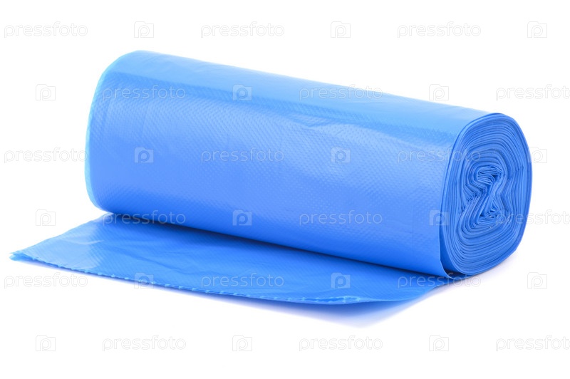 Рулон синих пластиковых мусорных пакетов, слегка раскатанный на горизонтальной поверхности