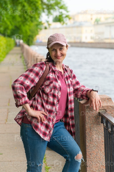 Привлекательная взрослая женщина стоит на набережной, опираясь на гранитный постамент
