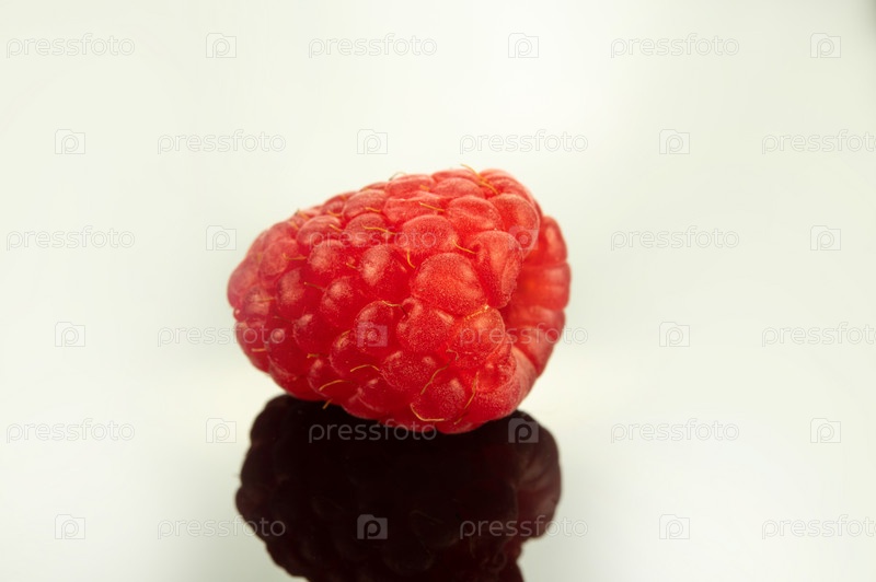 Сочная спелая малина с отражением снизу. Ягода блестит от сладкого сока