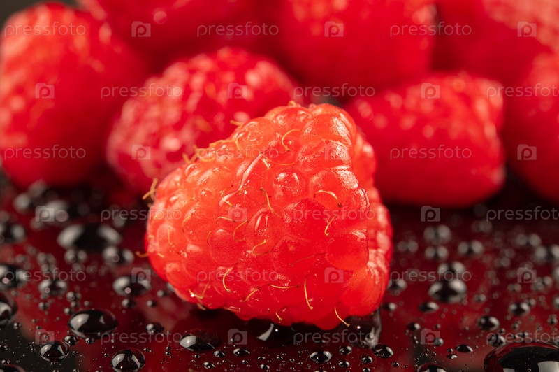 Горсть спелой малины в каплях воды
