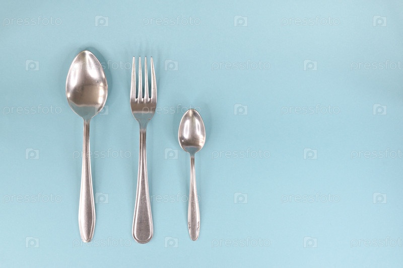 Столовая ложка, вилка и чайная ложка, разложенные в ряд на светлом фоне
