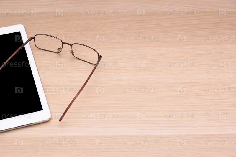 Очки и планшет лежат на деревянной поверхности стола