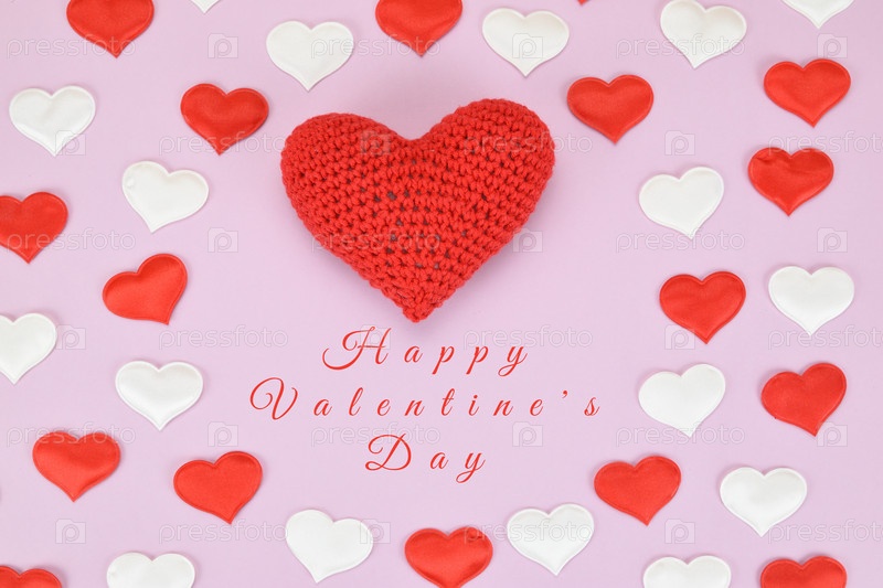 Узор на розовом фоне из маленьких красных и белых сердечек с большим в центре