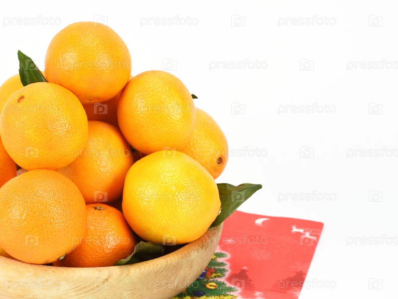 Крупный план спелых мандаринов в деревянной миске на белом фоне