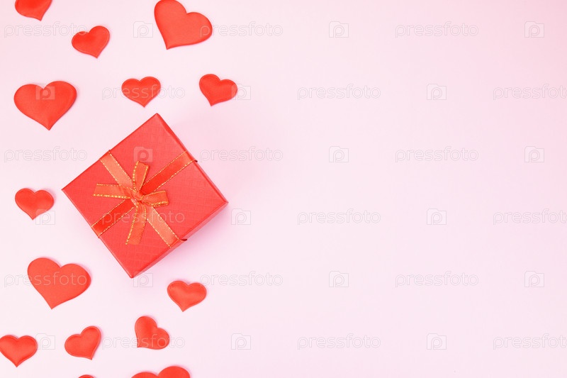 Красная подарочная коробка и маленькие декоративные сердечки на розовом фоне с местом для текста