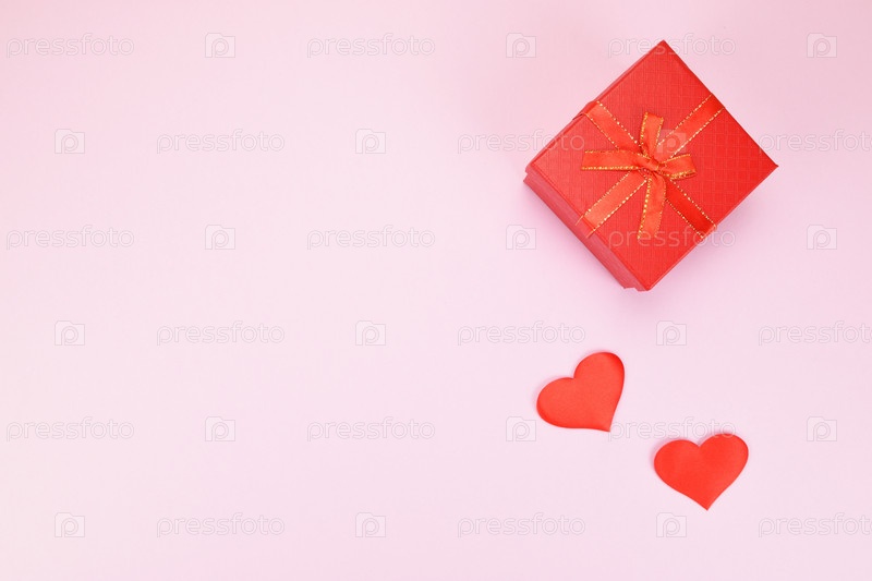 Красная подарочная коробка и маленькие декоративные сердечки на розовом фоне с местом для текста
