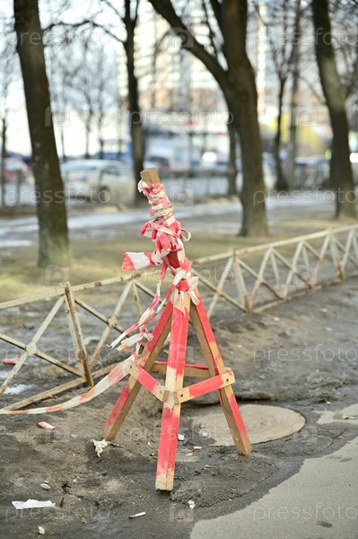 Деревянный столб, ограничивающий дорожное движение и закрывающий канализационный люк