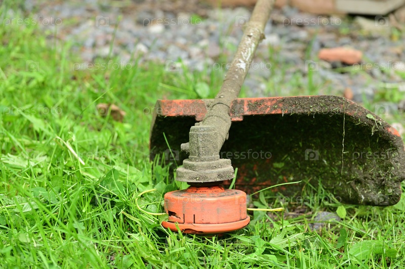 Триммерная катушка с выступающей леской и защитным кожухом на скошенном газоне