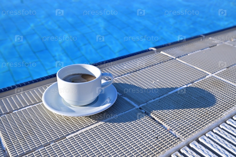 Белая чашка на блюдце с кофе стоит на краю бассейна. Чашка отбрасывает тень