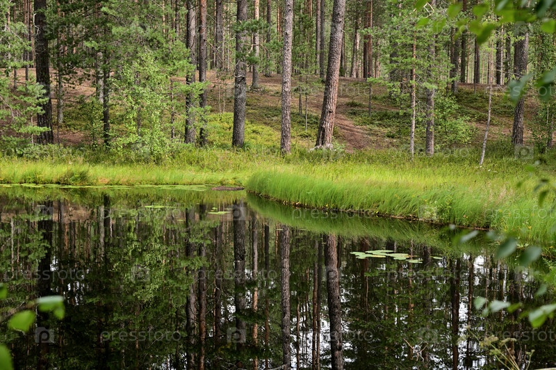 Болотистый берег лесного озера. Осока растет вдоль берегов. Водяные лилии в мутной воде