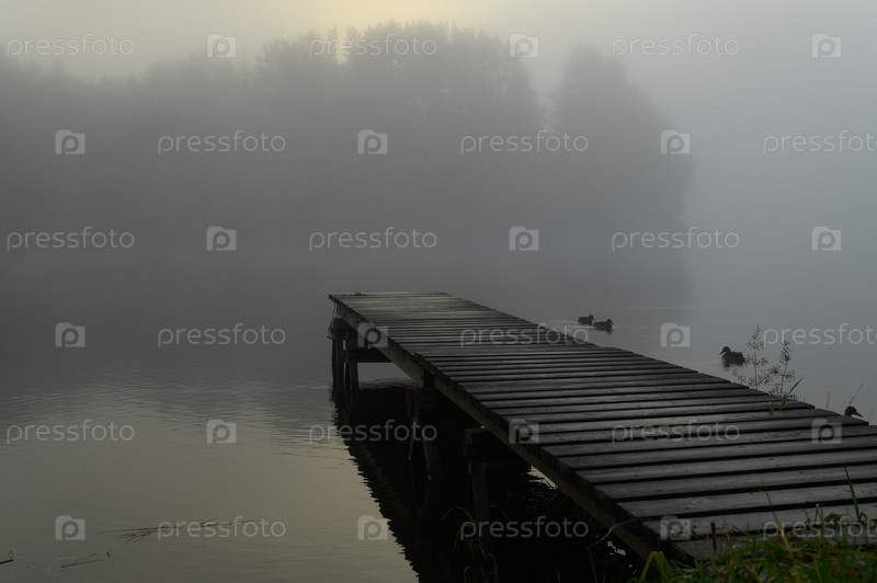 Утренний туман на реке. Солнце встает из-за деревьев и светит сквозь дымку