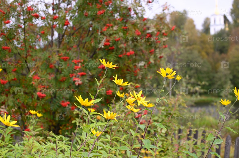 Желтые цветы на фоне красных гроздей рябины. Пожелтевшая осенняя листва