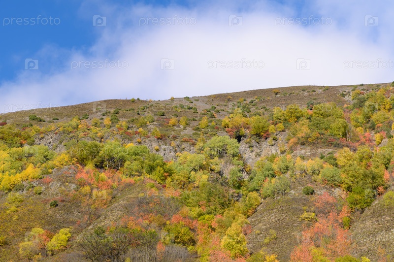 Осенний горный пейзаж. Склоны покрыты желтоватой сухой травой и огромными валунами