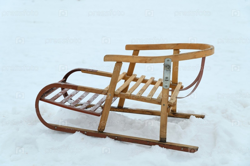 Старинные деревянные сани с металлическими вставками и креплениями. Сани на чистом снегу