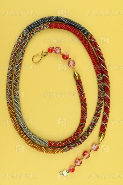 Женские украшения. Ожерелье, сплетенное из разноцветного бисера с декоративными стеклянными бусинами на обоих концах