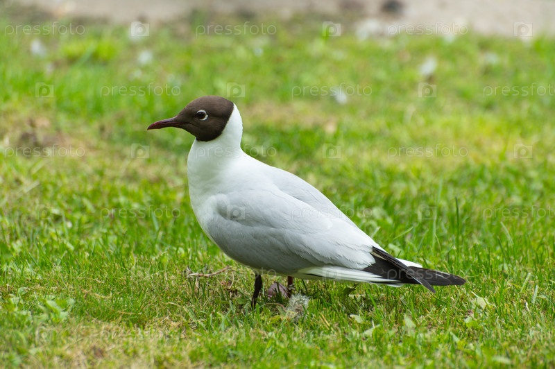 Чайка с красным клювом, черной головой и серыми крыльями собирает еду
