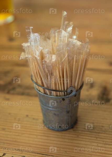 Зубочистки в пластиковой обертке, вставленные в небольшое жестяное ведерко