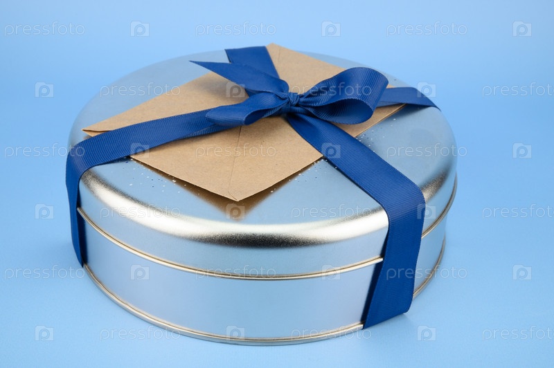 Металлическая подарочная коробка с бумажным конвертом, перевязанным синей лентой