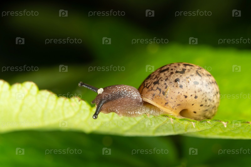 Улитка с торчащими рожками ползет по зеленому листу