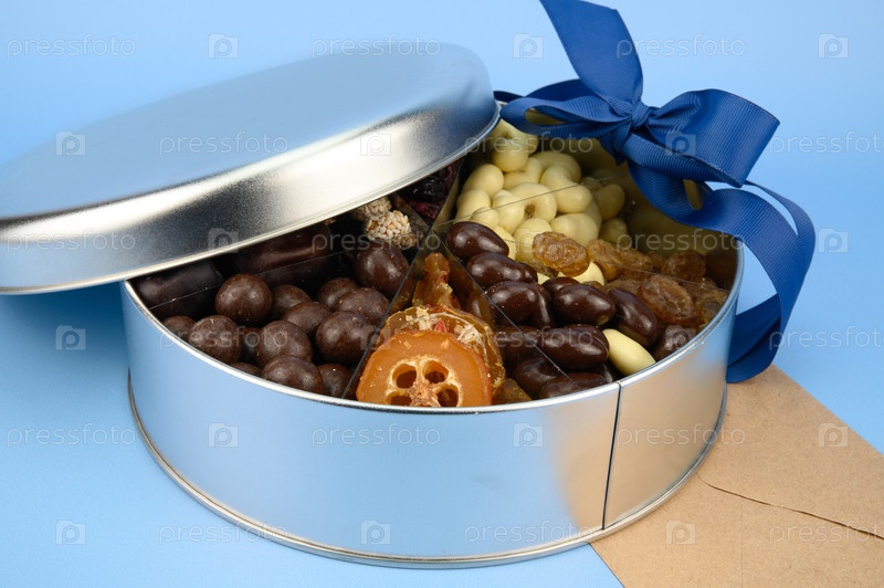 Металлическая подарочная коробка с сухофруктами и шоколадом