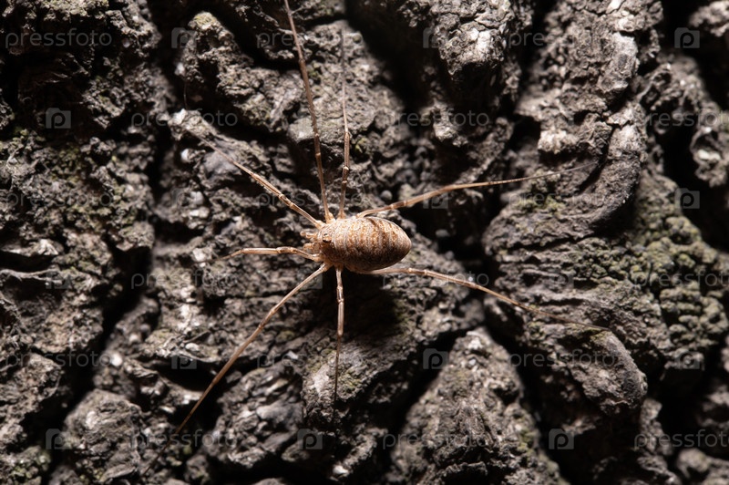 Вид сверху на паука, сидящего на шероховатой поверхности ствола дерева