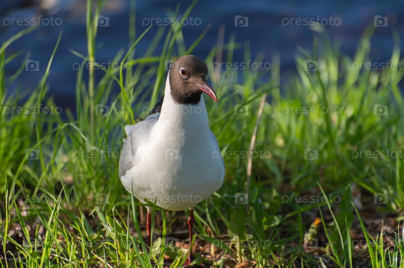 Чайка с красным клювом, черной головой и серыми крыльями собирает еду