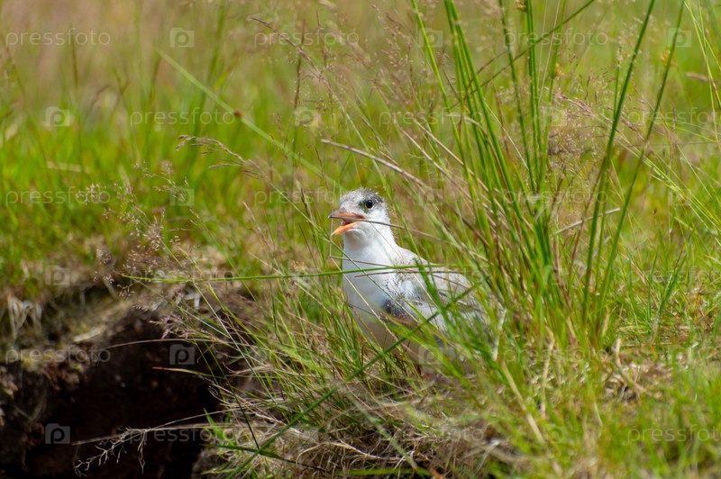 Взрослая чайка выглядывает из густой высокой травы и смотрит в камеру